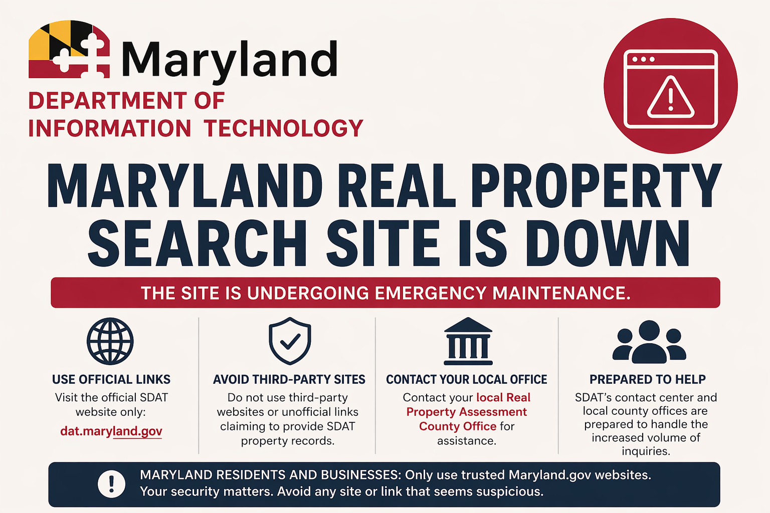 If you’ve tried to pull up a Maryland property record since Tuesday, April 14, you’ve already run into this. The State Department of Assessments and Taxation’s Real Property Search tool is offline. That’s the database many of us use every day for ownership, assessment, and sales history, and the one homeowners often use to check their own property record. State officials detected “suspicious activity” on the servers that support the site, took it down as a precaution, and as of the latest reporting, it’s still dark.